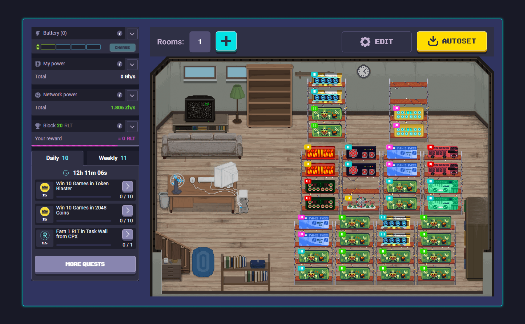 Each player has a personal mining room where virtual miners and racks can be placed. Upgrading this room allows players to increase their total mining power and earn more rewards.