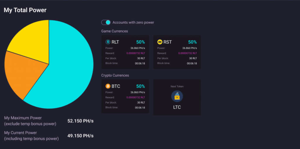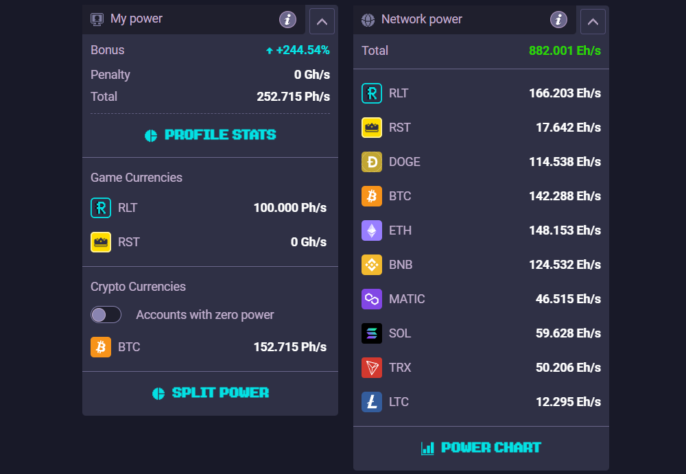 Mining power represents how much computational power you contribute to the RollerCoin network. The higher your mining power, the larger your share of the block rewards.